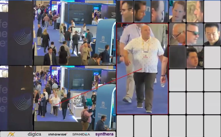 As a subject moves through the crowd, the system continuously builds a profile of who they are, drawing on multiple frames and camera angles over time to improve certainty as better quality images become available