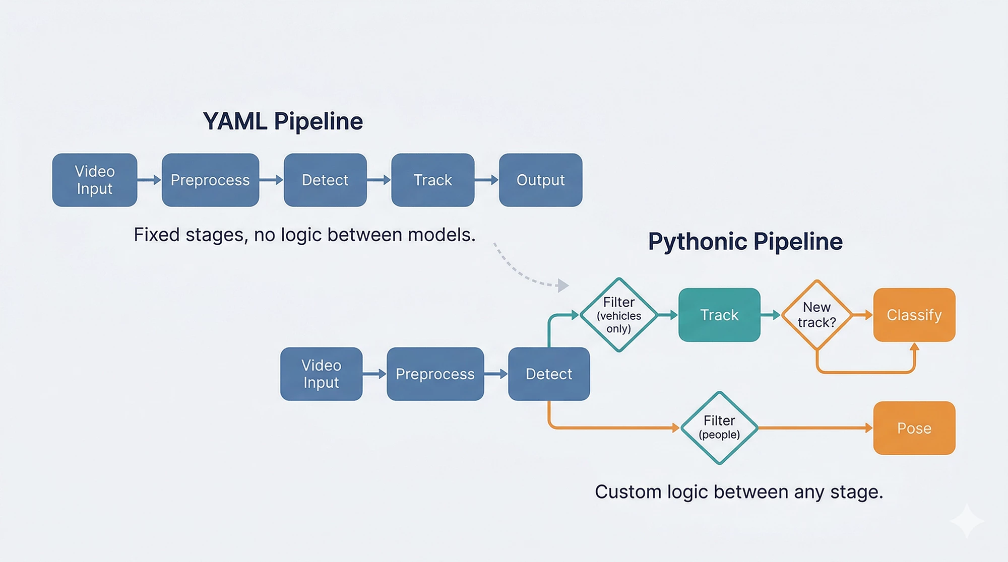 A customer needed to detect vehicles, track them, and run a secondary classifier only on newly appeared tracks entering a specific zone. Another wanted to split detections by class, run different models on each subset, and merge the results with custom business logic. A third wanted to prototype cascade pipelines in a Jupyter notebook before deploying to production.