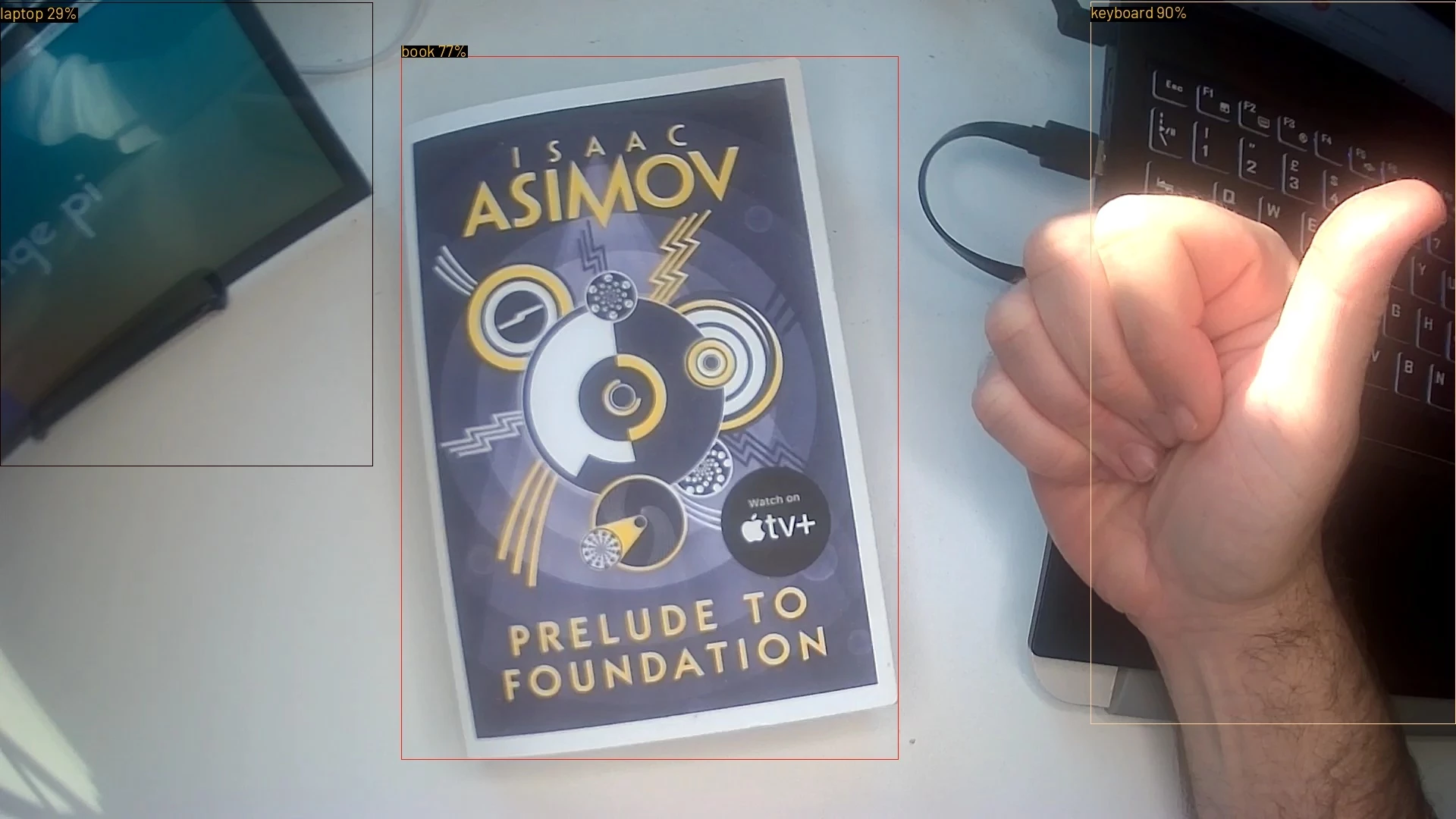 The system combines an object-recognition model, used to distinguish the operator’s hands from the book itself, with an OCR model that extracts the text of interest directly from the cover, enabling accurate, real-time identification of title, author, and publisher.
