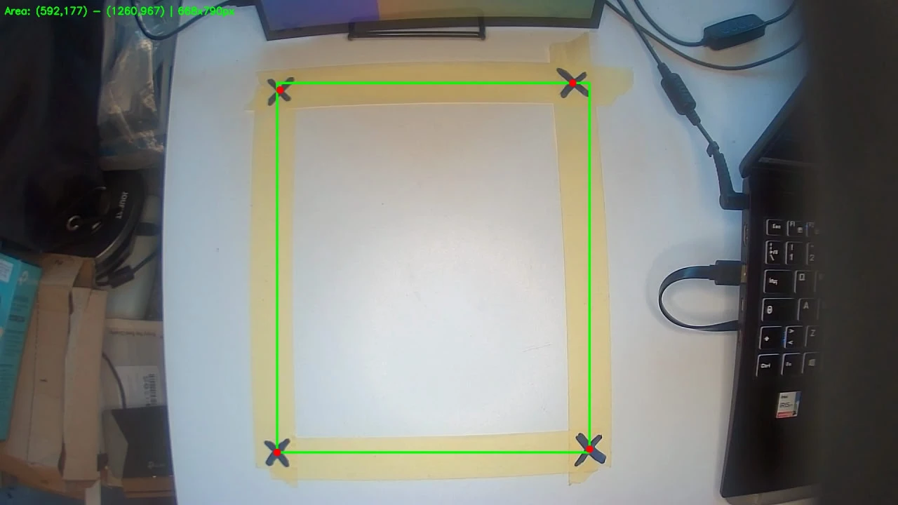 X on each corner of the loading area's rectangle, with a black marker on the masking tape and a calibration procedure based on