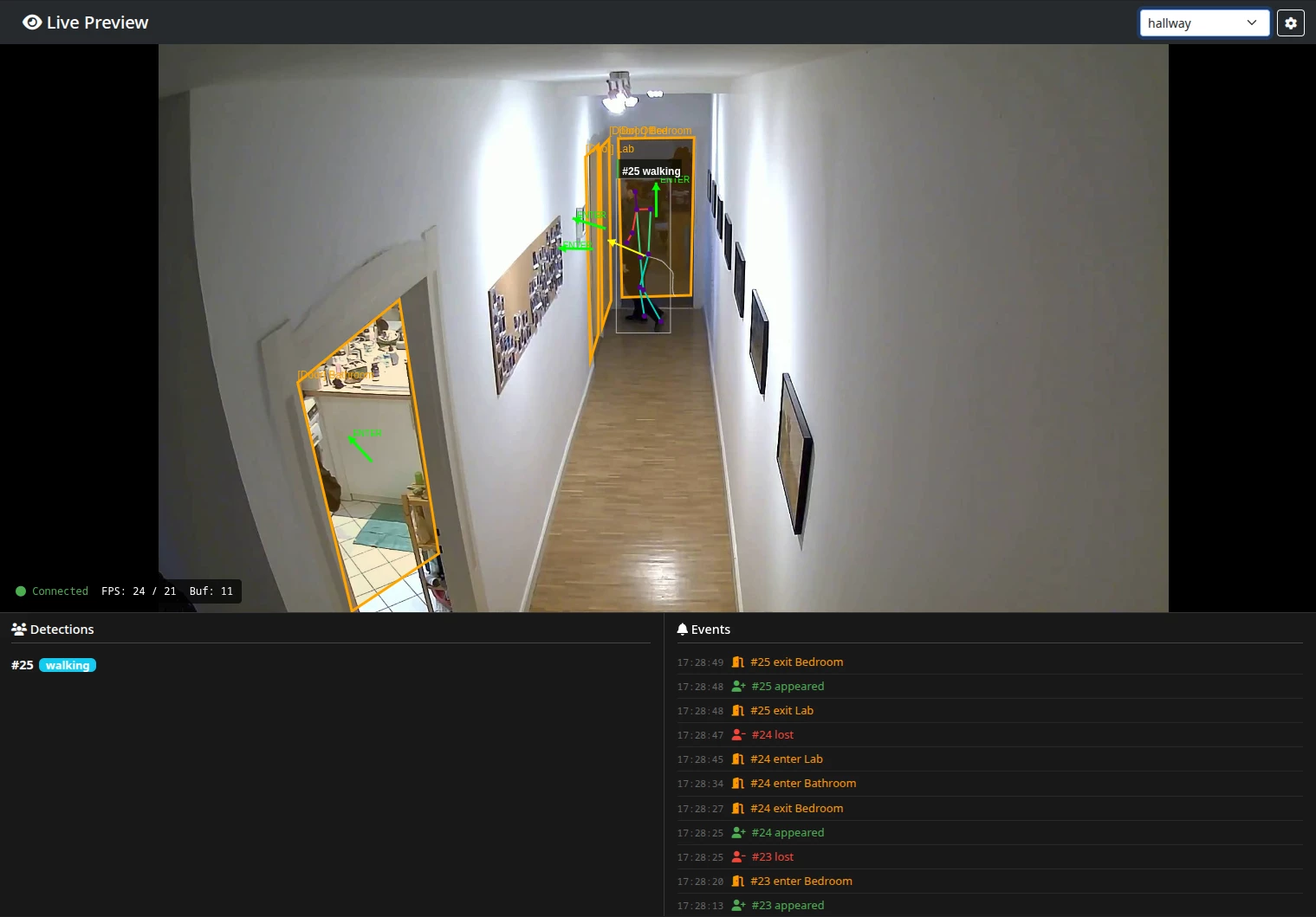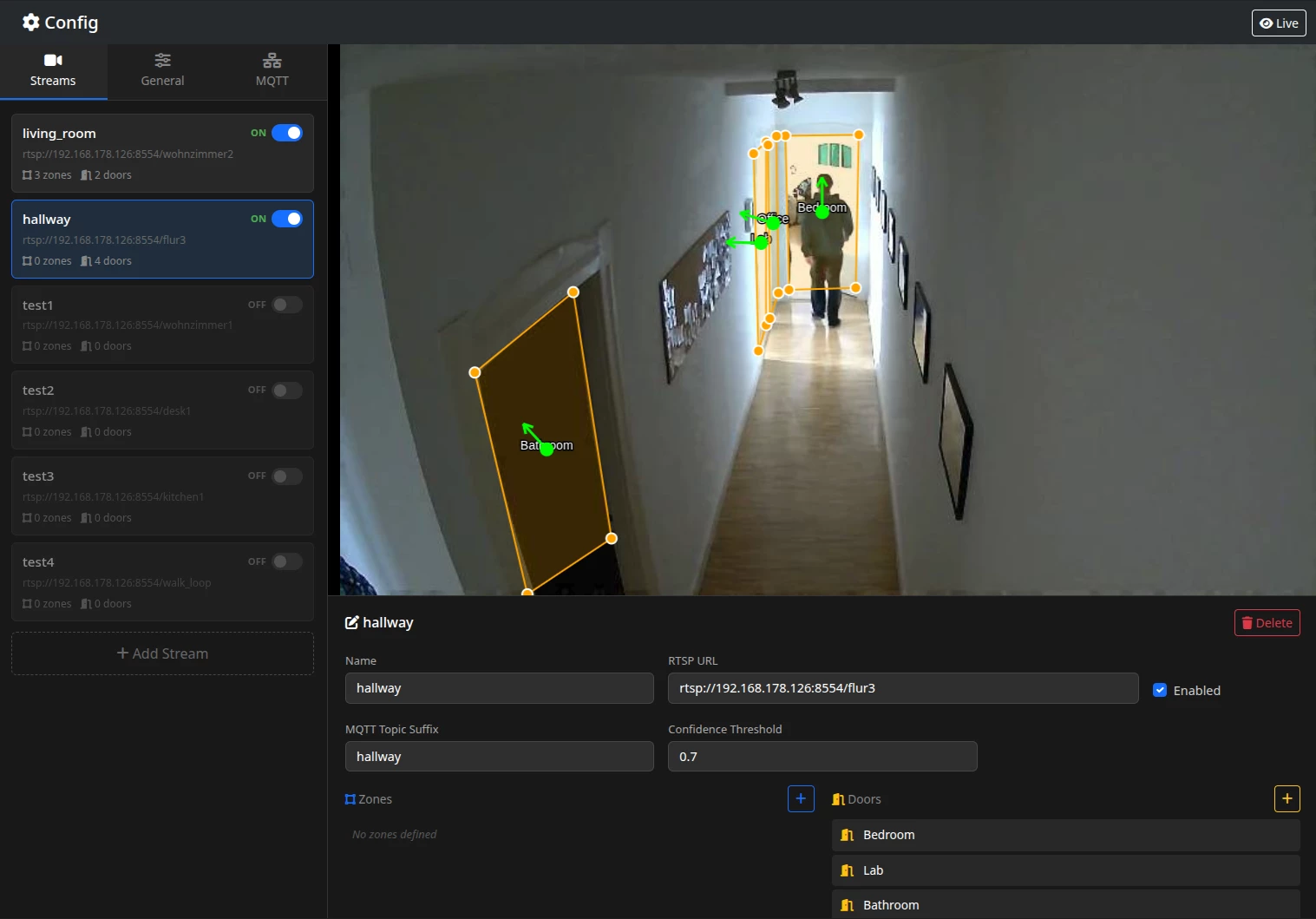 The config UI got a proper refactor - better styling, easier zone editing, and a camera switcher for multi-stream setups. It also gained the live view page, where you see exactly what the engine sees, overlaid with all the detection metadata.
