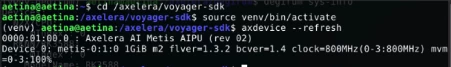 On boot up, first we need to make sure the Axelera Metis device is loaded properly and working using voyager-sdk. Open new terminal and refresh the Metis device as following: