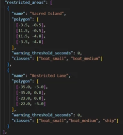 The user also defines “restricted zones” and rules for the restricted zones. All of these are defined in the settings.json file. User can specify these zones as non-self-intersecting, closed polygons and define alarm rules for each polygon. These rules state what classes of detected objects the rule applies to, and as how much dwell time to tolerate for the unauthorized classes of objects in that zone. User can define as many zones as desired and needed.