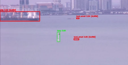 In the above image, you will notice that the ship and boats are marked in red but not the marine buoy. This is because in the “restricted area” settings for this particular area, we asked to trigger only for boats and ships. Of course we want this control so that fixed objects like marine buoys don’t trigger alarms even though we still want to monitor they are staying in their place for the safety of the ships.