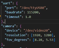At this point we need to make sure we have the correct device settings in the settings.json file. Mainly we need to make sure we specify the correct device names for the USB3 camera as well as the serial port for communications with the STM32 controller.
